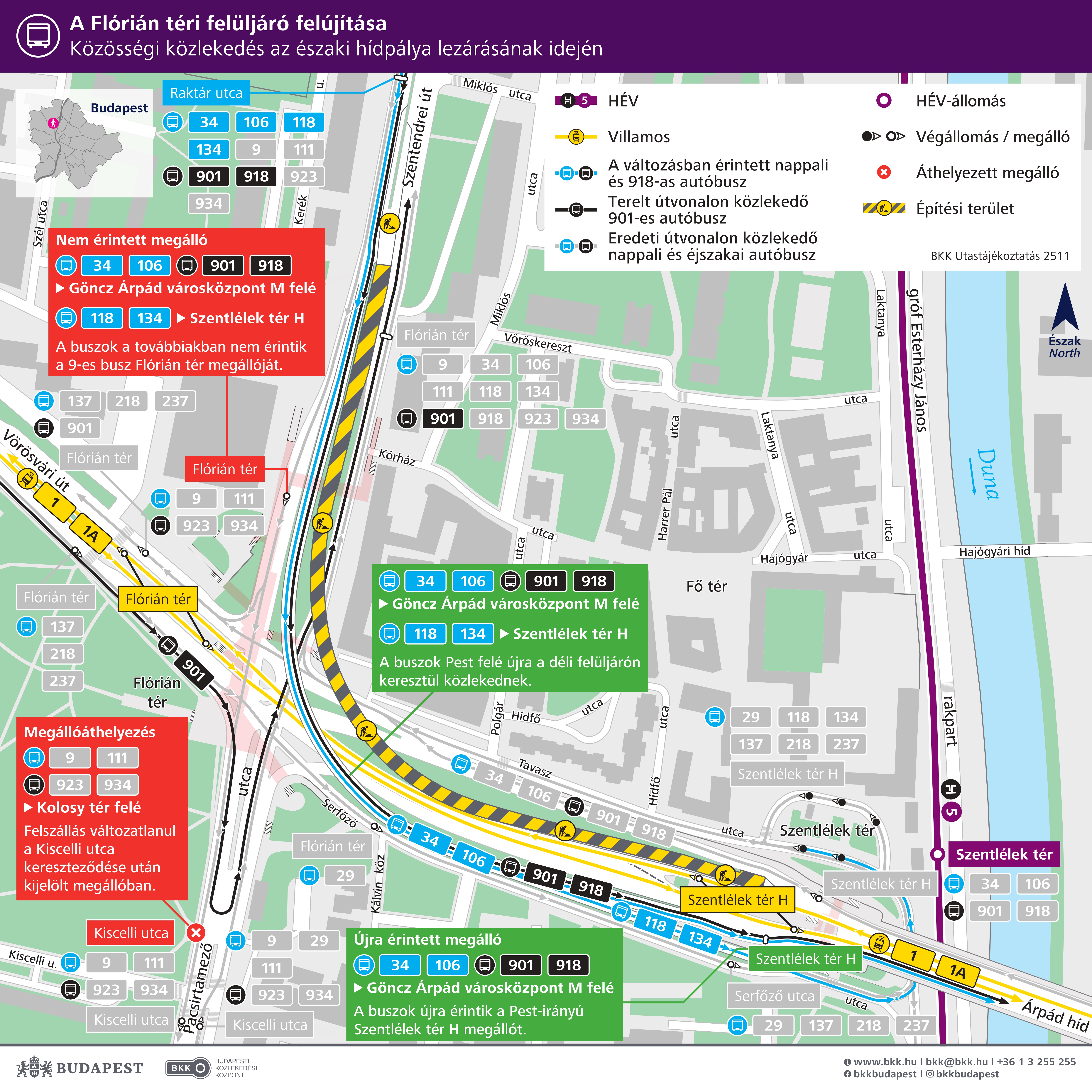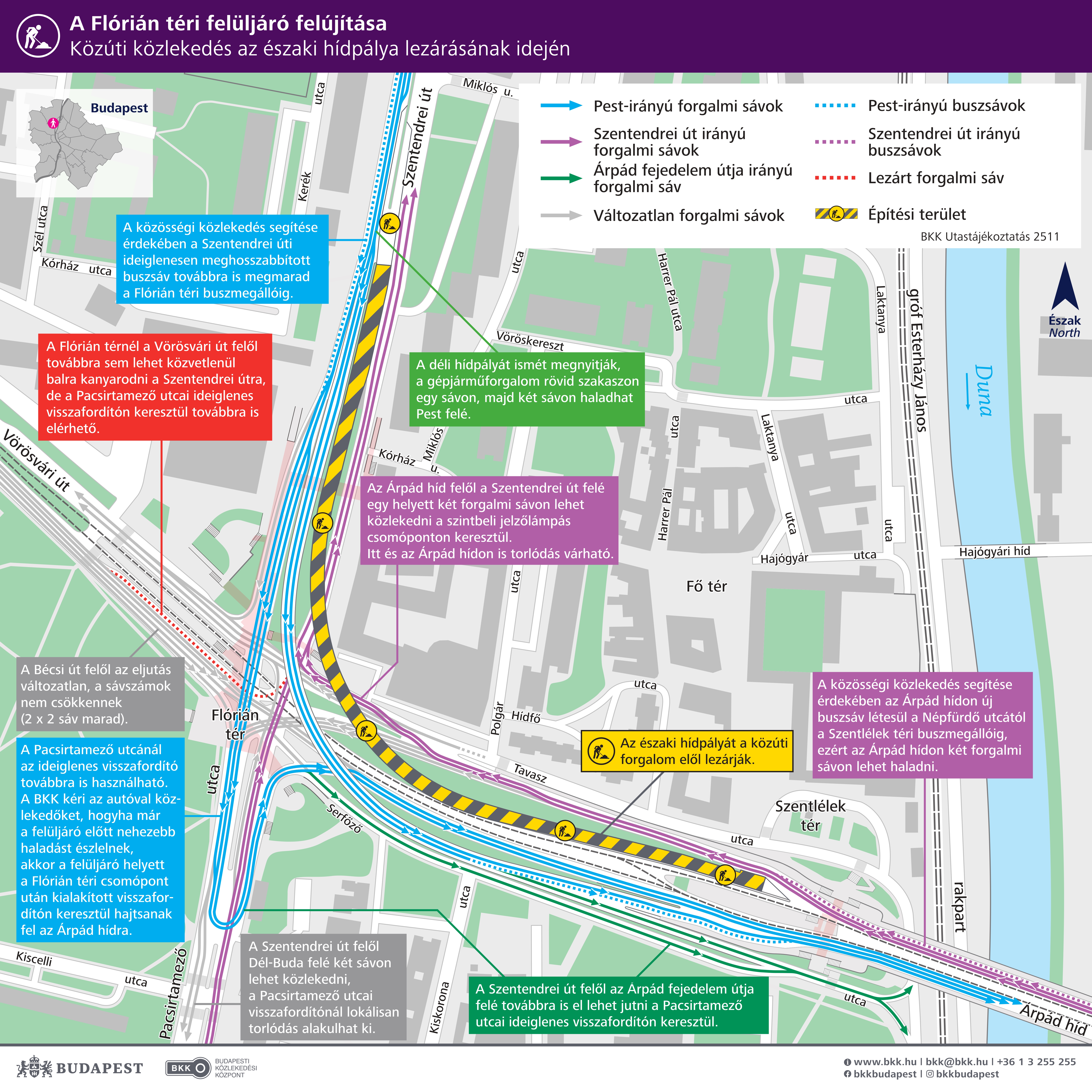 Újabb szakaszába lép a Flórián téri felüljárók felújítása: a korszerűsítés második ütemében november 21-én, péntek este, várhatóan 20 órától lezárják az északi hidat. Ekkortól a gépjárművel közlekedők az ideiglenes forgalmi rend szerint az Árpád híd felől a Szentendrei útra csak a felüljárók alatti csomópontban, két sávon jobbra kanyarodva tudnak közlekedni. A már megújult déli hídon a forgalom változatlanul a Szentendrei úti felhajtónál egy, azután két sávon haladhat az Árpád fejedelem útja, illetve Pest felé, valamint továbbra is használható a Pacsirtamező utcai visszafordító. A buszok haladásának segítése érdekében a meglévő buszsávok mellett további buszsávot jelölnek ki az Árpád hídon Buda felé. A BKK a jelentős változások és forgalomkorlátozások miatt kéri az arra közlekedőket, hogy ha lehetőségük van rá, a sűrített és előnyben részesített közösségi közlekedést vegyék igénybe. Egyúttal azt tanácsolja a gépjárművel közlekedőknek, hogy a felújítás hátralévő ideje alatt más útvonalon – a Flórián teret, illetve Pestről Buda felé az Árpád hidat elkerülve! – közelítsék meg az úti céljukat, mert nagy torlódások várhatók a környéken.